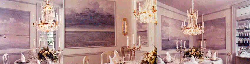 Combine a mural and paint palette within a theme to create your own atmosphere • Look at the Swedish example: cool soft colours which complement the hand painted seascape canvas panels • The Chinese dining room has murals inspired by hand painted Chinese wallpaper and colours taken from Limoges china • There is a more contemporary feel to the 50’s room which depicts abstract murals in the style of Milton Avery and complements the colourful 50’s furniture • The Charlie Chaplin ticket office invites you into a home movie theatre where the whimsical theme is continued with painted panels of Marilyn Monroe, ET and the Marx Brothers around a popcorn area. Call +44 (0)7761 425279 for more details. |
