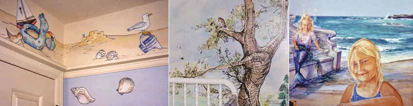 Awaken a child’s imagination with pictures on walls, ceilings and furniture, with fields of spots, stripes and plaids in fresh spring colours or a seaside with boats, shells, buckets and spades... Imagine a horse in a teenager’s stable, a castle for a pelmet and picture stories on doors. Jenny’s preference for using thin “watercolour” acrylic washes as backgrounds enables a subtle blending in with existing finishes. This can allow a smaller area of mural to be used. Call +44 (0)7761 425279 for more details. |